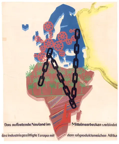 Herman Sörgel, «Das auftretende Neuland im Mittelmeerbecken verbindet das industriegesättigte Europa mit dem rohproduktenreichen Afrika», c. 1932. Reproducida en EURO—VISION: Undergrounding the Critical Mineral (FRAUD, 2025).